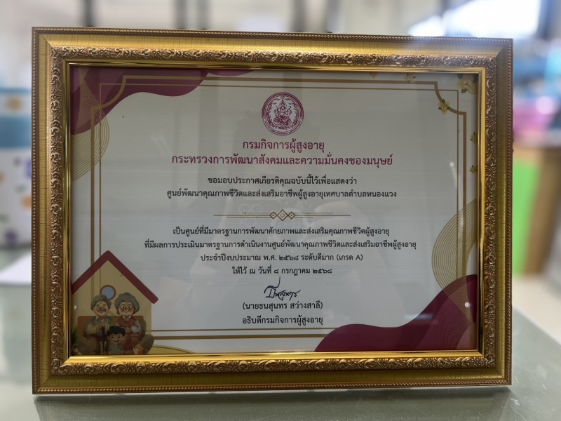 รับมอบประกาศเกียรติคุณ วันที่ 24 กันยายน 2568นายบุญธรรม ศรีวงษา นายกเทศมนตรีตำบลหนองแวง มอบหมายให้ นายเริงชัย พรหมโสฬสรองนายกเทศมนตรีตำบลหนองแวง เป็นตัวแทนรับมอบประกาศเกียรติคุณให้แก่ ศูนย์พัฒนาคุณภาพชีวิตและส่งเสริมอาชีพผู้สูงอายุ (ศพอส.) ตำบลหนองแวง ซึ่งเป็นศูนย์ที่มี มาตรฐานการพัฒนาศักยภาพและส่งเสริมคุณภาพชีวิตผู้สูงอายุ ที่ผ่านการประเมินประจำปี 2568 ด้วยระดับ ดีมาก (เกรด A)ศูนย์ฯ แห่งนี้ไม่เพียงมุ่งพัฒนาศักยภาพผู้สูงอายุ แต่ยังเป็นแรงขับเคลื่อนสำคัญในการสร้าง ชุมชนเข้มแข็ง องค์ความรู้เพื่อผู้สูงวัย และการสร้างกิจกรรมสร้างรายได้เสริม ให้ผู้สูงอายุมีคุณภาพชีวิตที่ดีขึ้นอย่างยั่งยืนการได้รับประกาศเกียรติคุณครั้งนี้สะท้อนถึงความร่วมมือของ เทศบาล ชุมชน ครูอาสา และครอบครัวผู้สูงอายุ ในการพัฒนาคุณภาพชีวิตอย่างแท้จริง